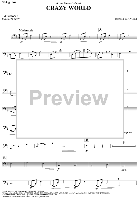 "Crazy World - String Bass" Sheet Music by Henry Mancini