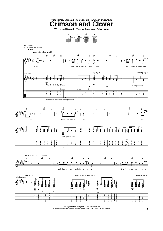 Digital Sheet Music for Crimson And Clover by Tommy James, Peter Lucia, Tommy James and the Shondells, Joan Jett scored for Guitar Tab; id:381457