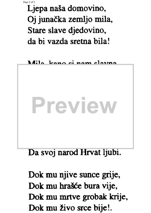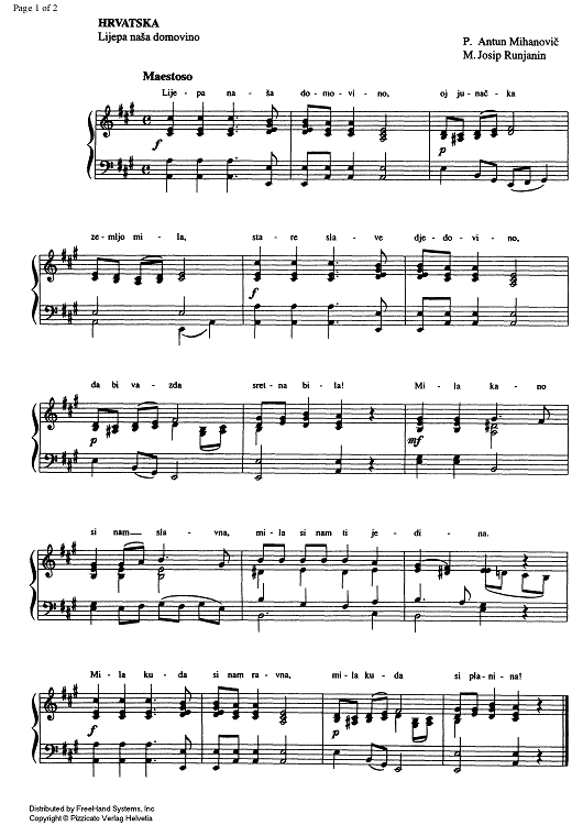"Croatia - Lijepa nasa domovino" Sheet Music by Josip Runjanin