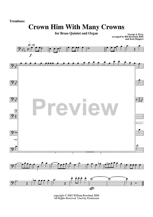 Digital Sheet Music for Crown Him With Many Crowns - Trombone by George J. Elvey, Bill Rowland, Kent Ruppert scored for Brass Quintet and Organ; id:314138