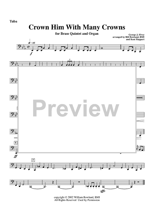 Digital Sheet Music for Crown Him With Many Crowns - Tuba by George J. Elvey, Bill Rowland, Kent Ruppert scored for Brass Quintet and Organ; id:314139