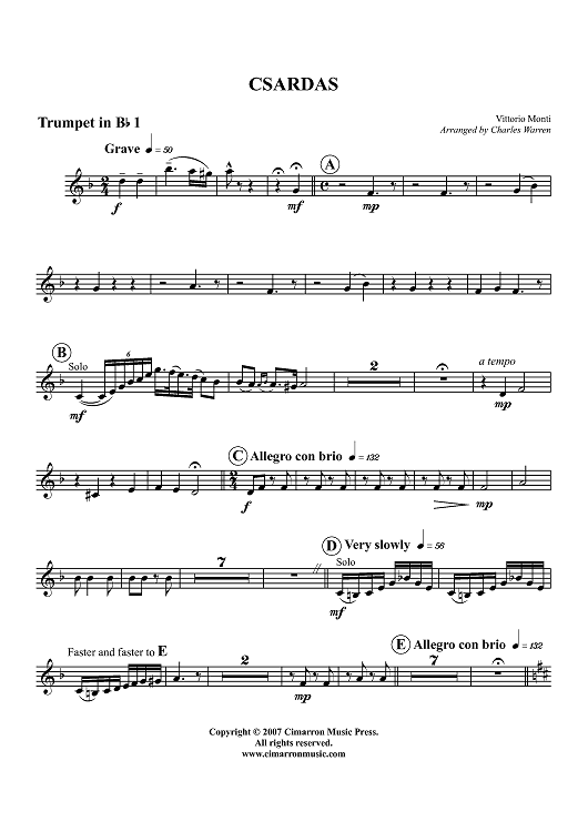 Digital Sheet Music for Csardas - Trumpet 1 in B-flat by Charles Warren, Vittorio Monti scored for Brass Quintet; id:360786