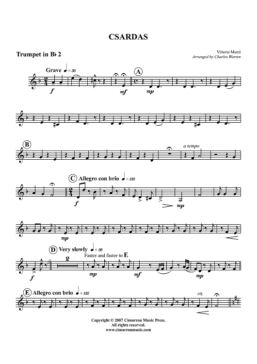 Digital Sheet Music for Csardas - Trumpet 2 in B-flat by Charles Warren, Vittorio Monti scored for Brass Quintet; id:360787