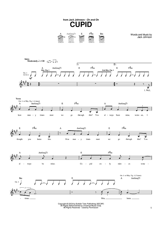 Digital Sheet Music for Cupid by Jack Johnson scored for Guitar Tab; id:373168