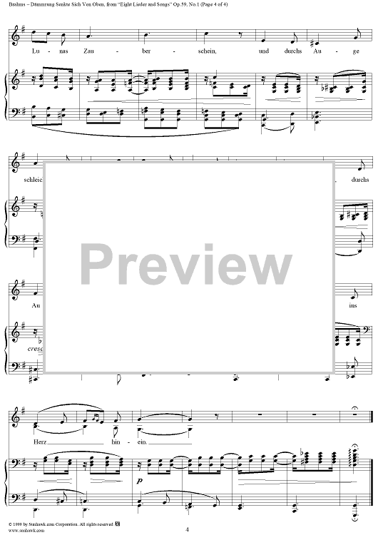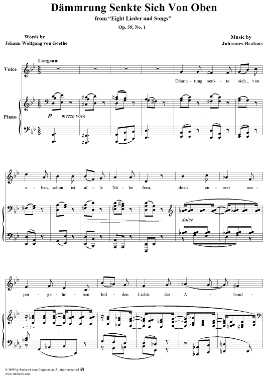 Digital Sheet Music for Dämmrung senkte sich von oben - No. 1 from "Eight Lieder and Songs" Op. 59 by Johann Wolfgang von Goethe, Johannes Brahms scored for Voice/Piano; id:274140