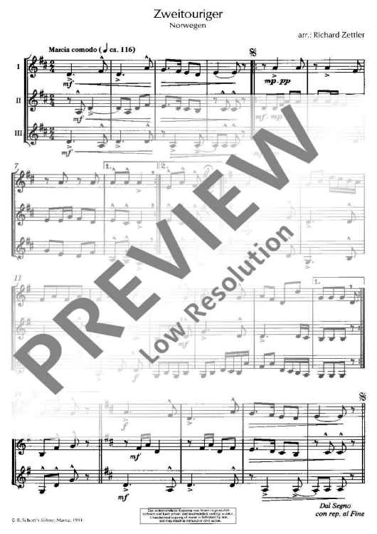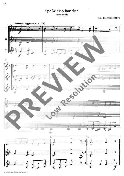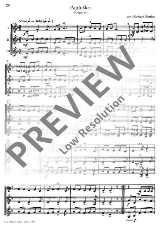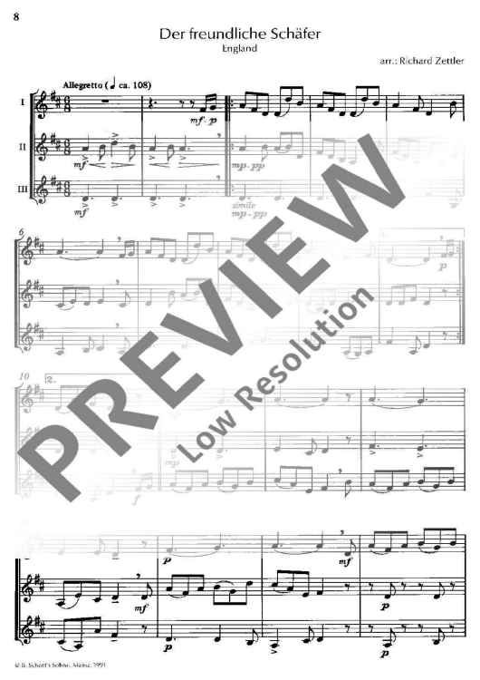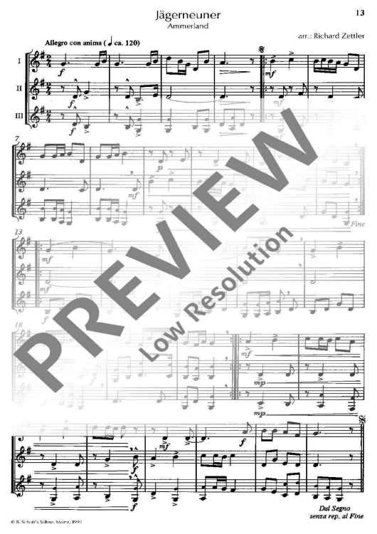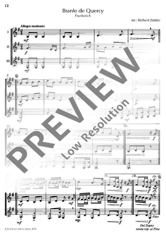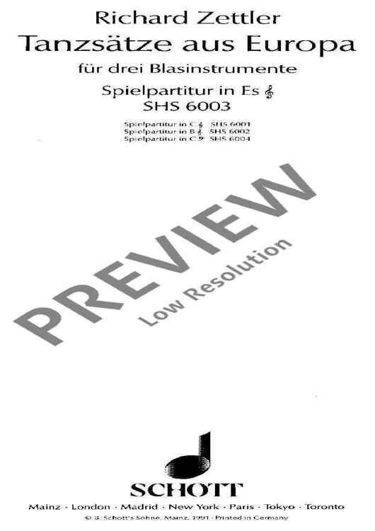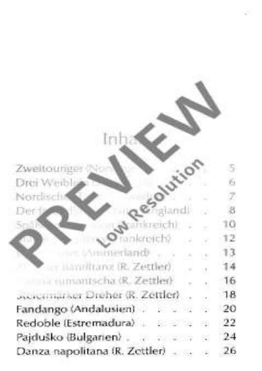 This collection consists mainly of unknown dance movements from northern, western and southern Europe, intermingled with original movements by Richard Zettler and written for small groups of players. The music is arranged so that it can be played by woodwind or brass instruments in various keys. Thus many combinations of Instruments can be used as desired.