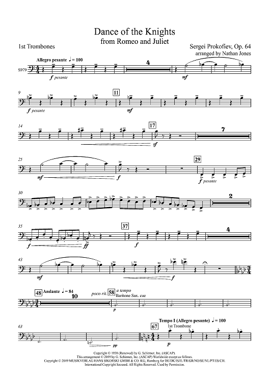 Digital Sheet Music for Dance of the Knights from Romeo and Juliet - Trombone 1 by Sergei Prokofiev, Nathan Jones scored for Concert Band; id:502679
