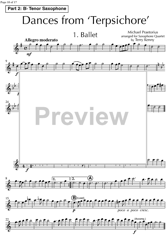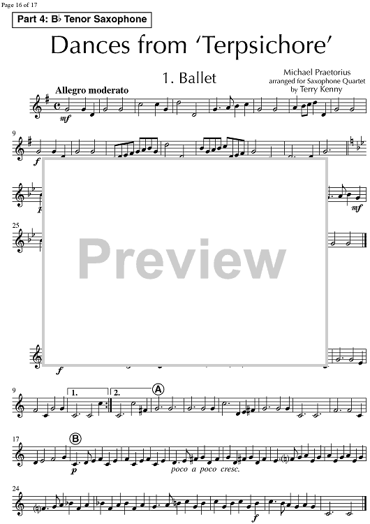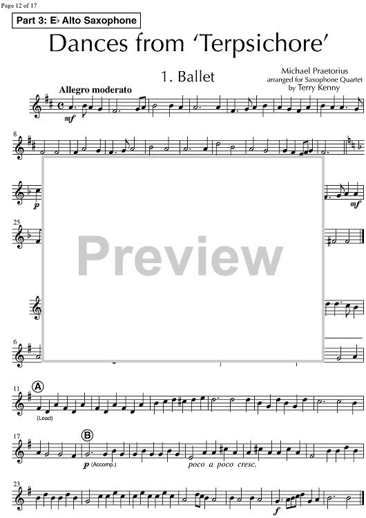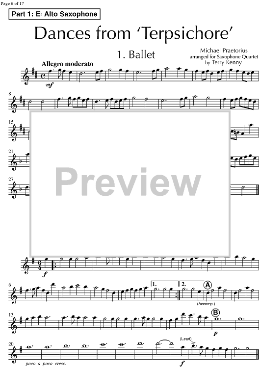 Digital Sheet Music for Dances from Terpsichore by , Michael Praetorius, Terry Kenny scored for Saxophone Quartet; id:322183