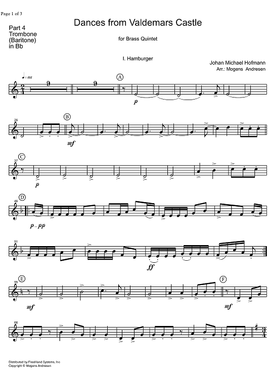 Digital Sheet Music for Dances from Valdemars Castle - B-flat Trombone 2 by Mogens Andresen, Johan Michael Hofmann scored for Brass Quintet; id:328102