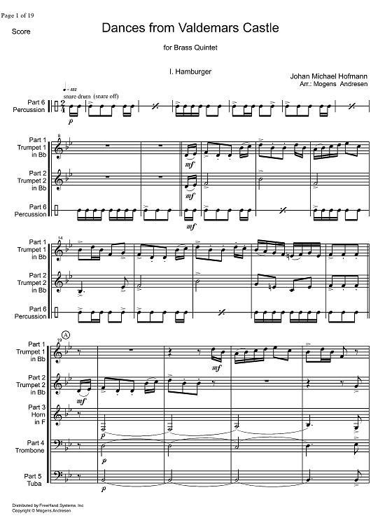 Digital Sheet Music for Dances from Valdemars Castle - Score by , Mogens Andresen, Johan Michael Hofmann scored for Brass Quintet; id:328097
