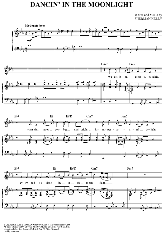Digital Sheet Music for Dancin' in the Moonlight by Sherman Kelly, King Harvest scored for Piano/Vocal/Chords; id:363957