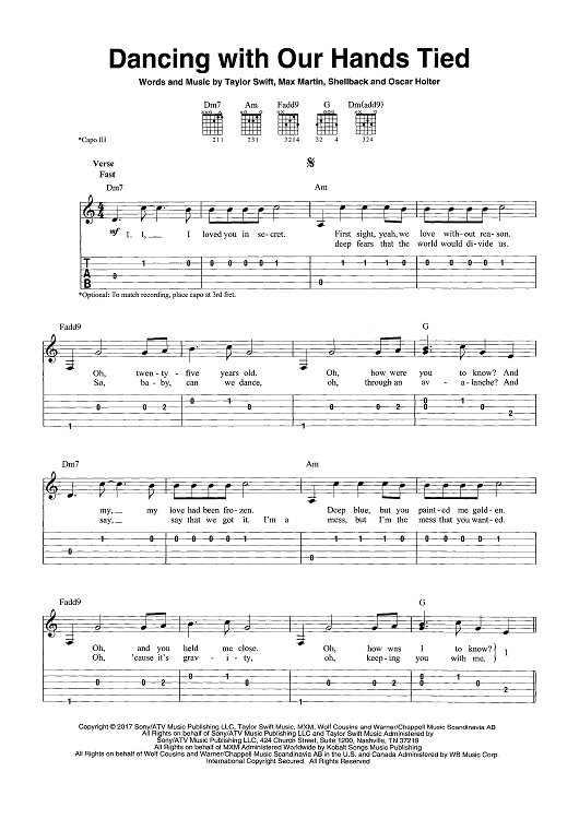 Digital Sheet Music for Dancing With Our Hands Tied by Max Martin, Taylor Swift, Shellback, Oscar Holter scored for Easy Guitar Tab/Vocal; id:466094