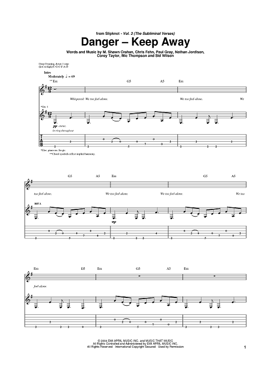 Digital Sheet Music for Danger - Keep Away by Shawn Crahan, Chris Fehn, Paul Gray, Joey Jordison, Slipknot, Corey Taylor, Mic Thompson, Sid Wilson scored for Guitar Tab; id:379160