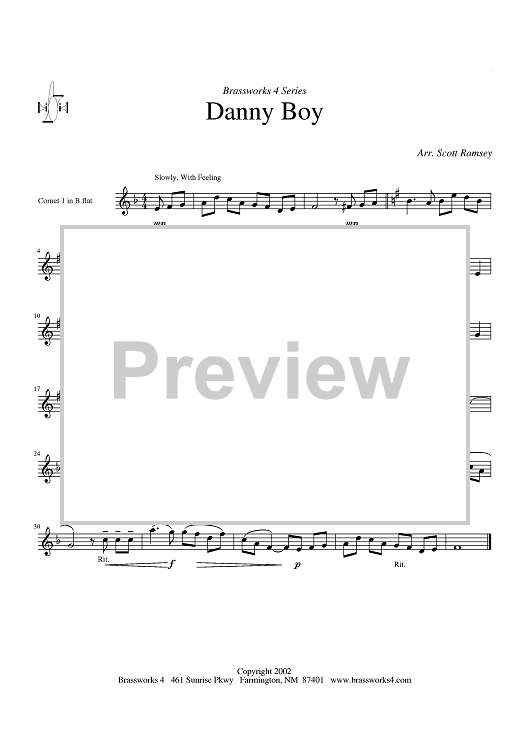 Digital Sheet Music for Danny Boy - Cornet 1/Trumpet 1 by Scott A. Ramsey scored for Brass Quartet; id:316864