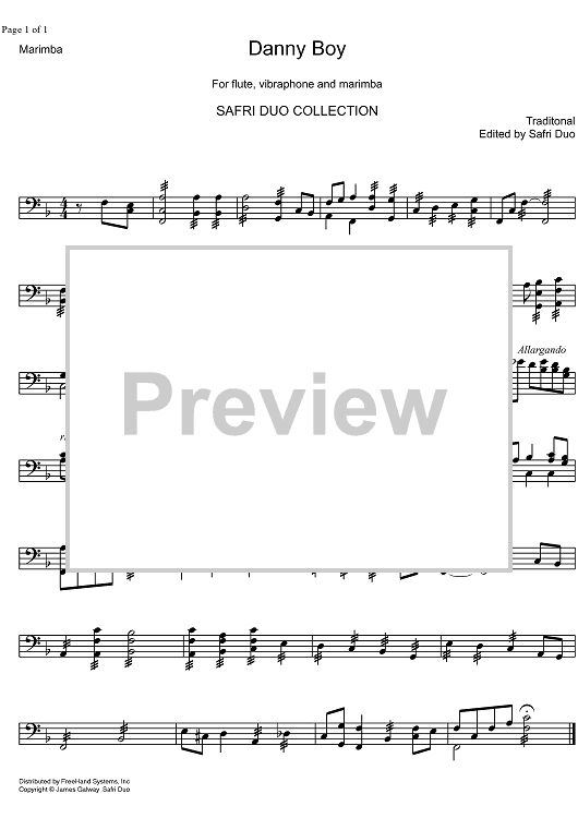 Digital Sheet Music for Danny Boy - Marimba by James Galway, Safri Duo, Traditional scored for Flute/Vibraphone/Marimba; id:327055