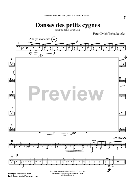 Digital Sheet Music for Danses des petits cygnes - from the ballet Swan Lake - Part 4 Cello or Bassoon by , Peter Ilyich Tchaikovsky, Daniel Kelley scored for Instrumental Quartet; id:423513