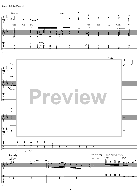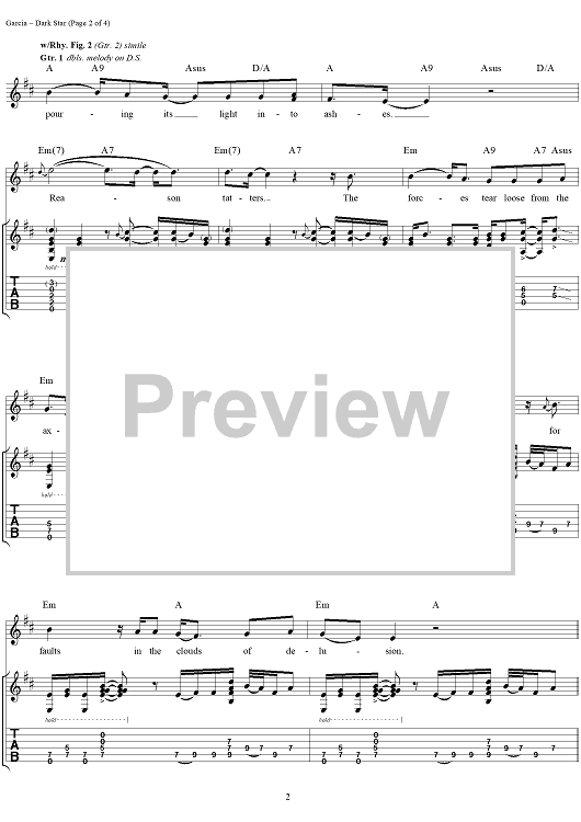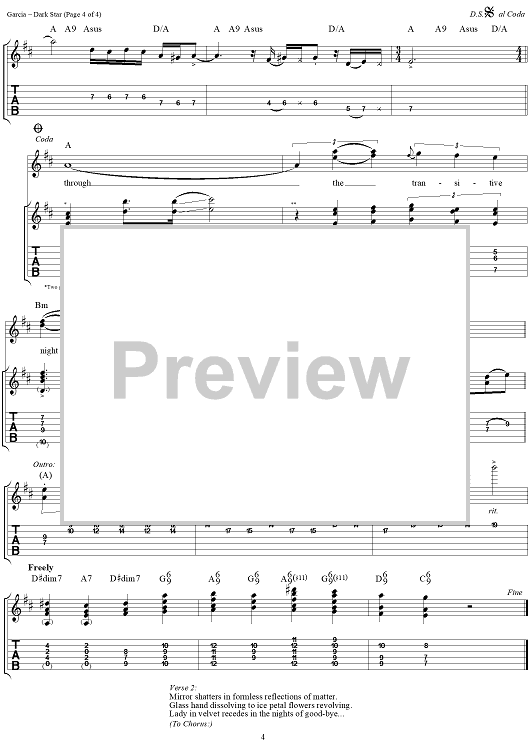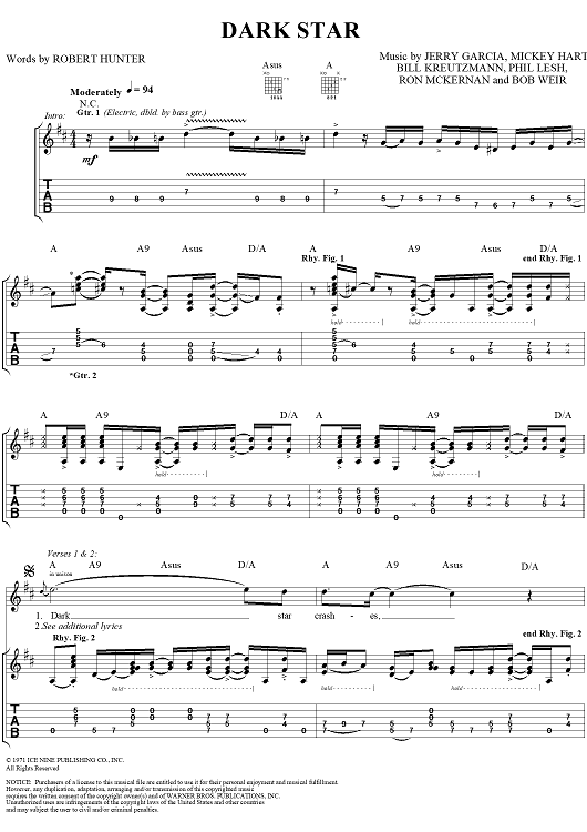 Digital Sheet Music for Dark Star by Jerry Garcia, Robert Hunter, Bob Weir, Phil Lesh, Mickey Hart, Bill Kreutzmann, Ron McKernan, Grateful Dead scored for Guitar Tab/Vocal; id:114108