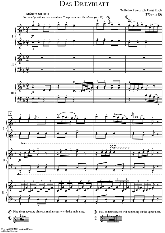 Keyboard trios (three pianists at one keyboard) are not only an enjoyable form of ensemble music, but are also indispensable tools in developing rhythm, dynamics, tempo consistency, and group musicianship skills in any pianist. The original works of W. F. Bach, Fodor, Gurlitt, Handel, Mozart, Rachmaninoff, and Streabogg are included, in score format (with all three parts on the same page), along with essential performance notes and helpful editorial fingerings and footnotes.