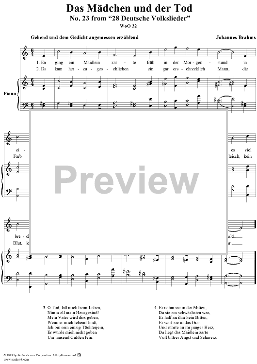 Digital Sheet Music for Das Mädchen und der Tod - No. 23 from "28 Deutsche Volkslieder" WoO 32 by Johannes Brahms scored for Voice/Piano; id:274166