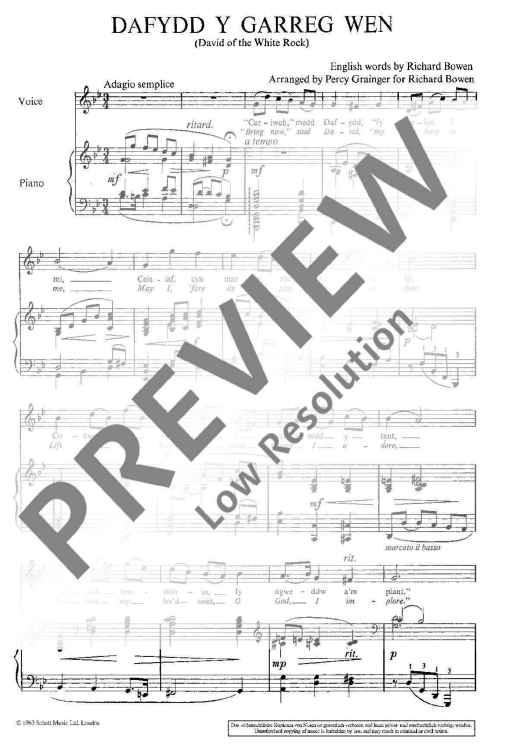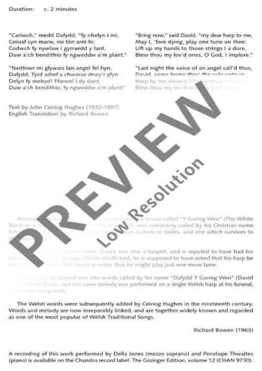 According to tradition, the Bard David lived in a house called "Y Garreg Wen" (The White Rock) in a remote situation in North Wales. He was commonly called by his Christian name followed by the name of his house, a common custom in Wales, and one which survives to the present day.Like many other Welsh Bards, David was also a harpist, and is reputed to have had his harp continually at his side. On his death-bed, he is supposed to have asked that his harp be once more placed in his hands in order that he might play just one more tune.The melody he played was afterwards called by his name "Dafydd Y Garreg Wen" (David of the White Rock), and this same melody was performed on a single Welsh harp at his funeral, as was his dying wish.The Welsh words were subsequently added by Ceiriog Hughes in the nineteenth century. Words and melody are now inseparably linked, and are together widely known and regarded as one of the most popular of Welsh Traditional Songs.Richard Bowen (1963)