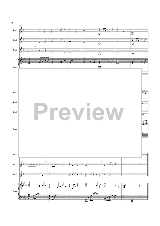 Digital Sheet Music for Dawn Awakes - Score by Kathy Essmiller scored for Trumpet Trio and Piano; id:410810