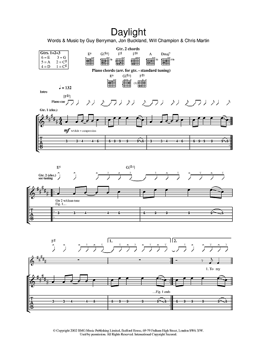 Digital Sheet Music for Daylight by Coldplay scored for Guitar Tab; id:377687