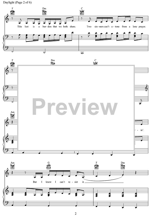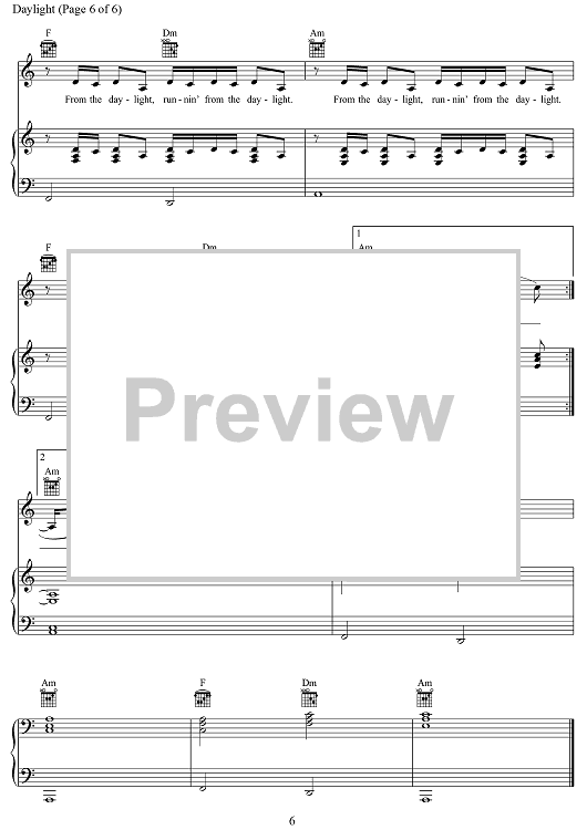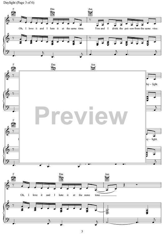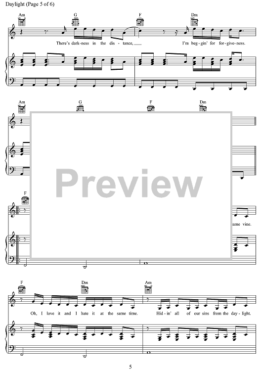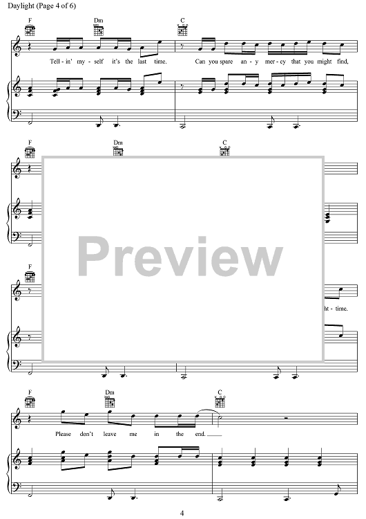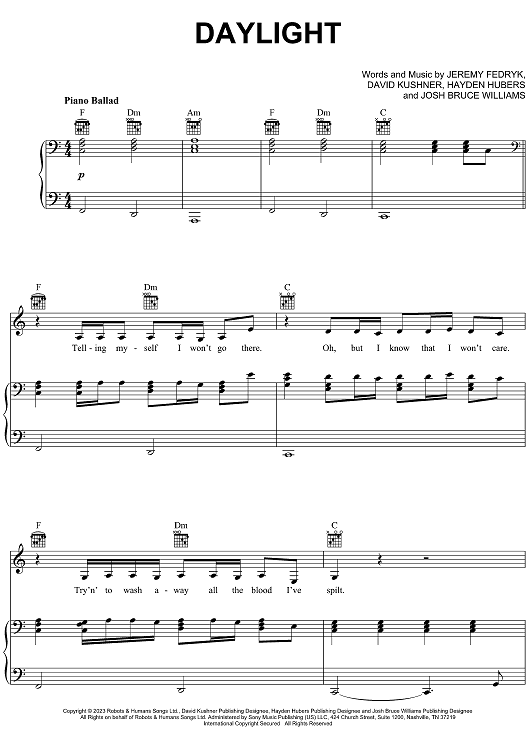 Digital Sheet Music for Daylight by David Kushner, Jeremy Fedryk, Hayden Hubers, Josh Bruce Williams scored for Piano/Vocal/Chords; id:500162