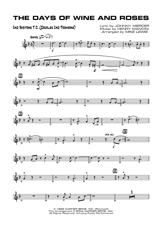 Digital Sheet Music for Days of Wine and Roses - Baritone 2 TC by Henry Mancini, Johnny Mercer, Mike Lewis scored for Jazz Ensemble; id:358796