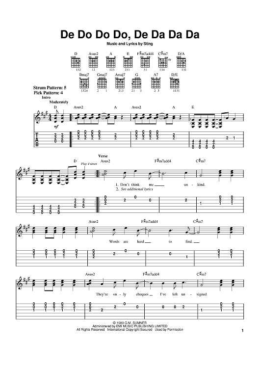 Digital Sheet Music for De Do Do Do, De Da Da Da by Sting, The Police scored for Easy Guitar; id:370065