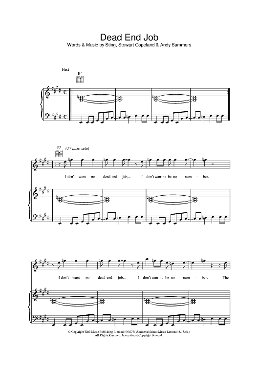 Digital Sheet Music for Dead End Job by Sting, The Police, Stewart Copeland, Andy Summers scored for Piano/Vocal/Chords; id:390816