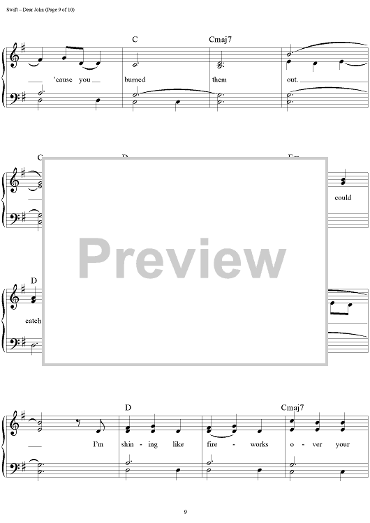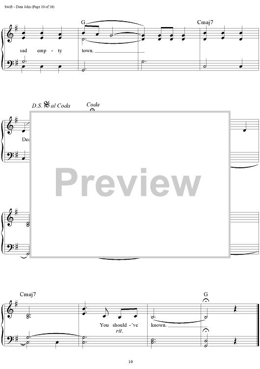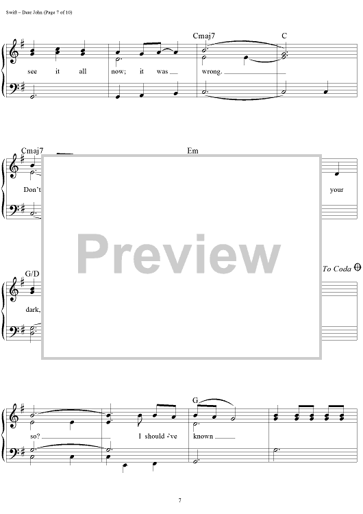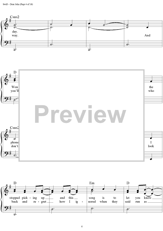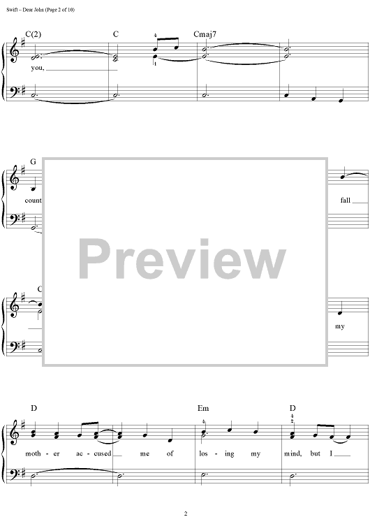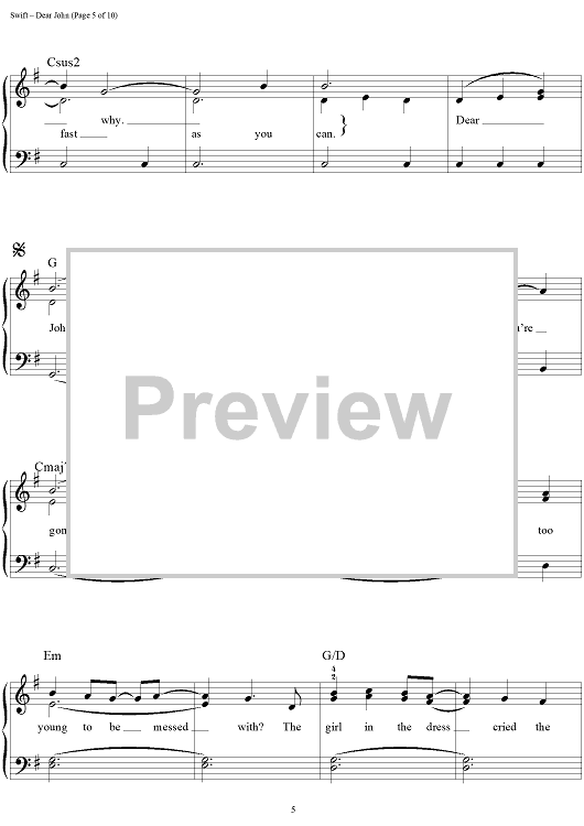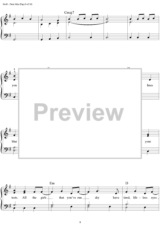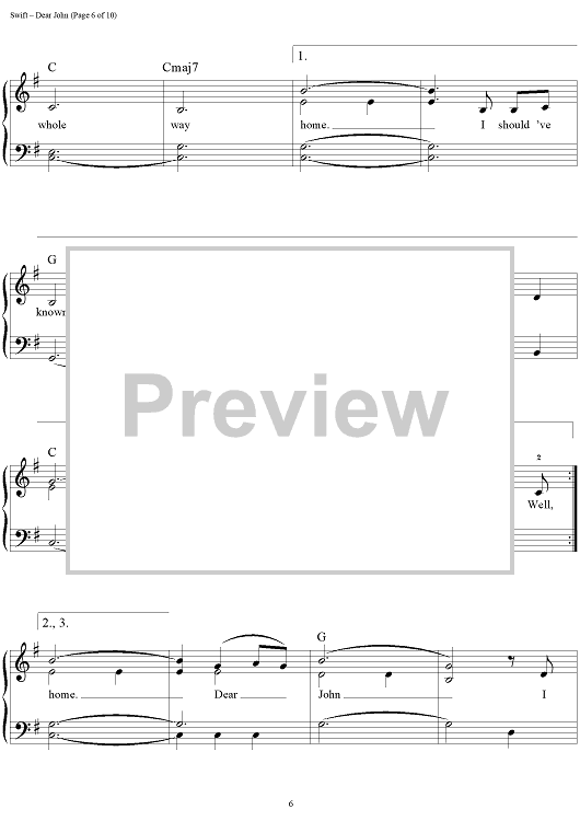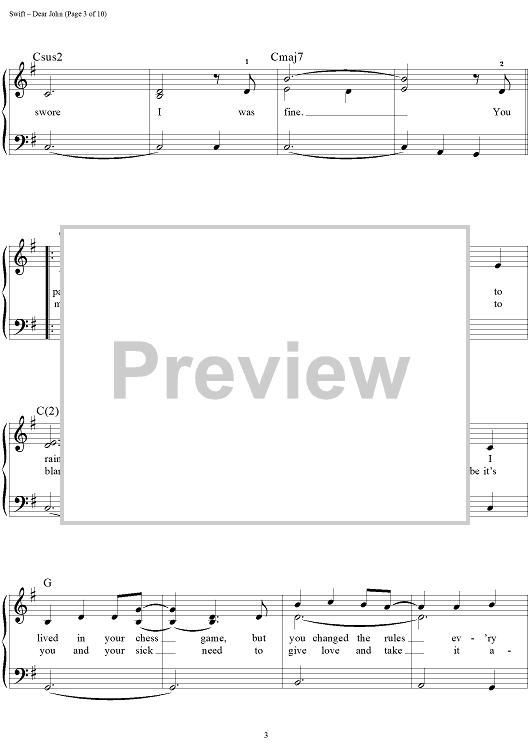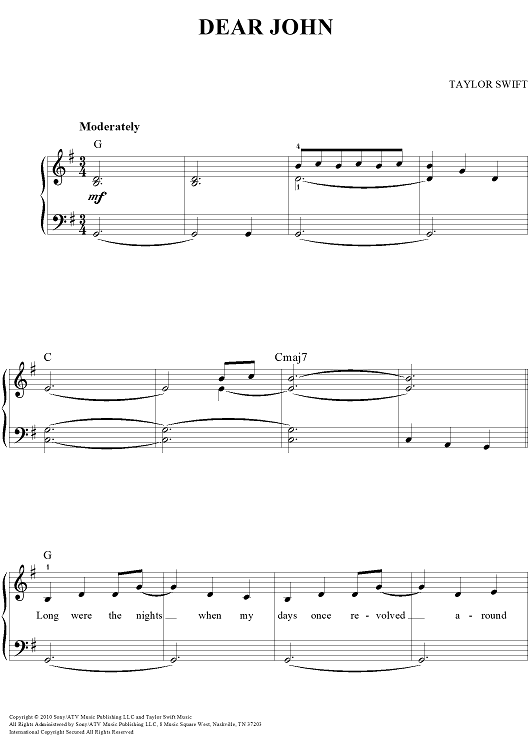 Digital Sheet Music for Dear John by Taylor Swift scored for Easy Piano/Vocal/Chords; id:457226
