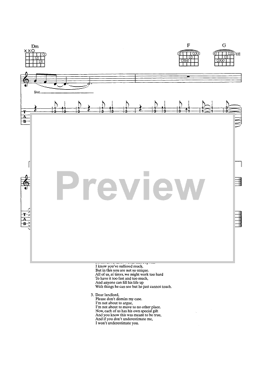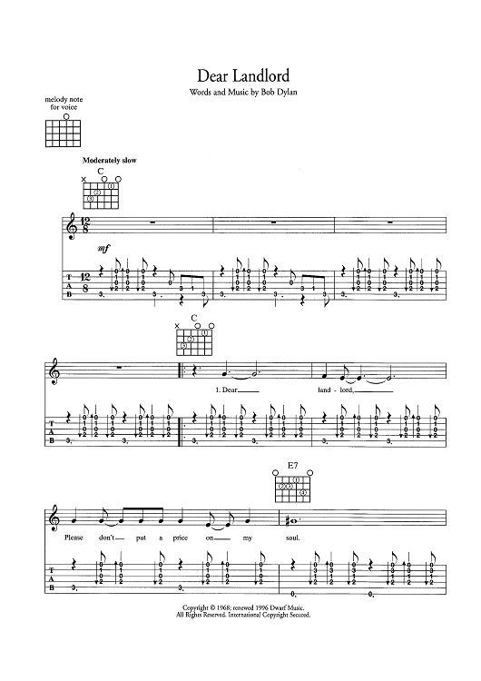 Digital Sheet Music for Dear Landlord by Bob Dylan scored for Guitar Tab/Vocal/Chords; id:445426