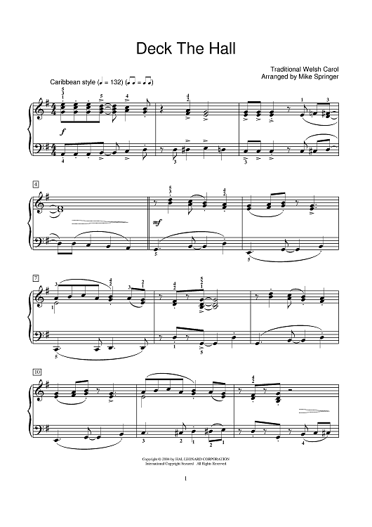 Digital Sheet Music for Deck The Hall by Traditional Welsh Melody, Mike Springer scored for Piano; id:379242