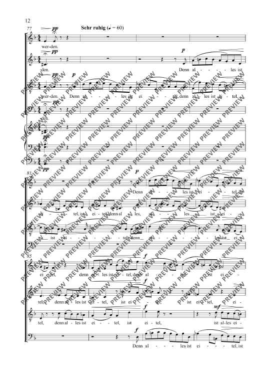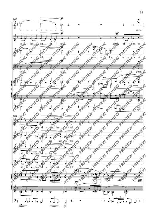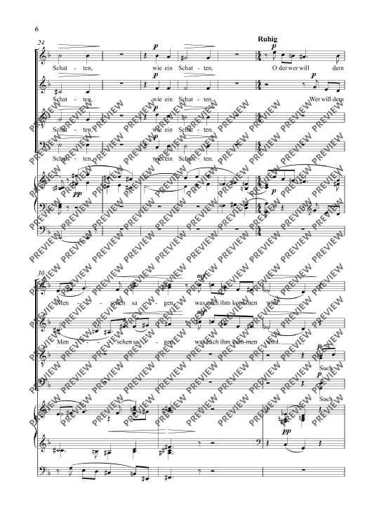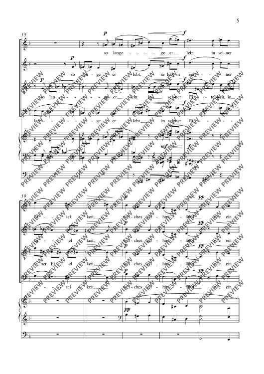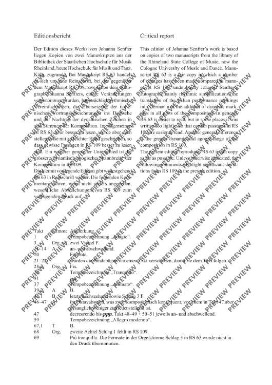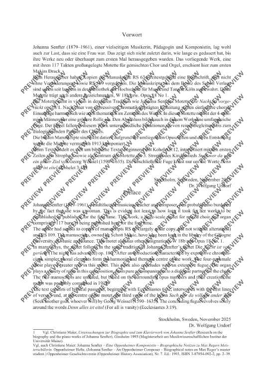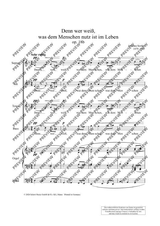 The motet Denn wer weiß, was dem Menschen nutz ist im Leben op. 18/2 by the composer Johanna Senfter is published here for the first time. After an introduction characterised by expressive chromaticism, simpler choral elements form the harmonic and thematic centre of the work. The four-part male choir plays a greater role in this motet. This work also concludes with an extensive fugue. The organ plays a variety of roles in this composition, from pure accompaniment to a dialogue partner for the choir.
