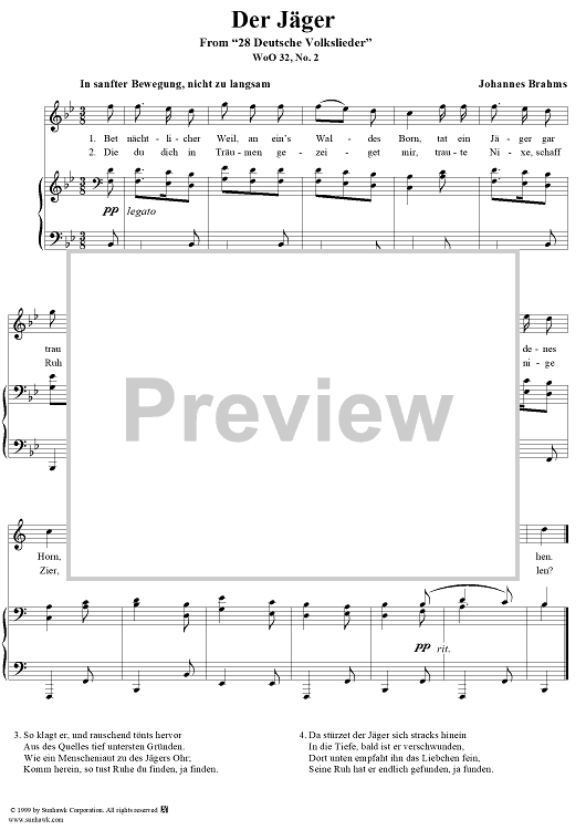 Digital Sheet Music for Der Jäger - No. 2 from "28 Deutsche Volkslieder" WoO 32 by Johannes Brahms scored for Voice/Piano; id:274339