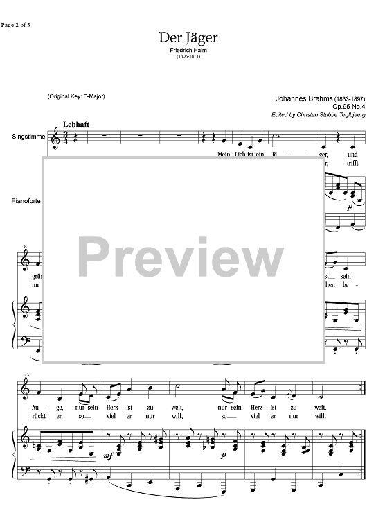Digital Sheet Music for Der Jäger Op.95 No. 4 by , Johannes Brahms scored for Alto or Bass/Piano; id:338152