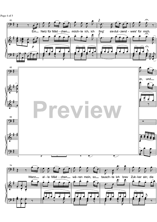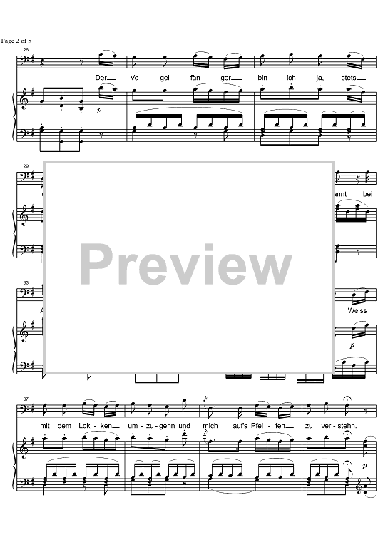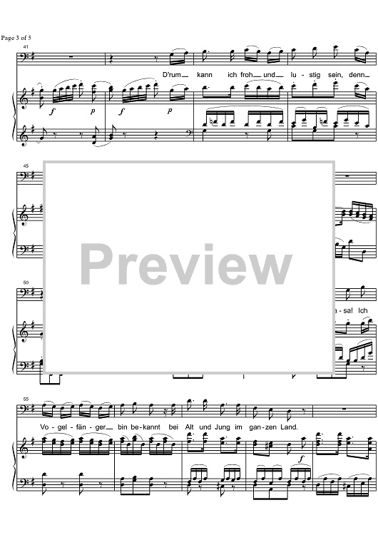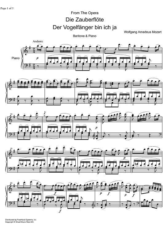 Digital Sheet Music for Der Vogelfänger bin Ich ja from Die Zauberflöte KV620 by Wolfgang Amadeus Mozart, SMN Archive Collection scored for Baritone/Piano; id:326972