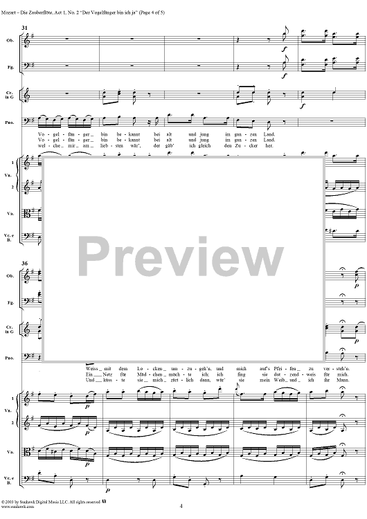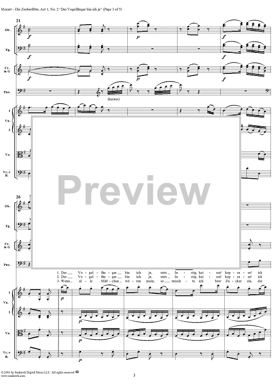 Digital Sheet Music for "Der Vogelfänger bin ich ja", No. 2 from "Die Zauberflöte", Act 1 (K620) - Full Score by Wolfgang Amadeus Mozart scored for Voice and Orchestra; id:291494