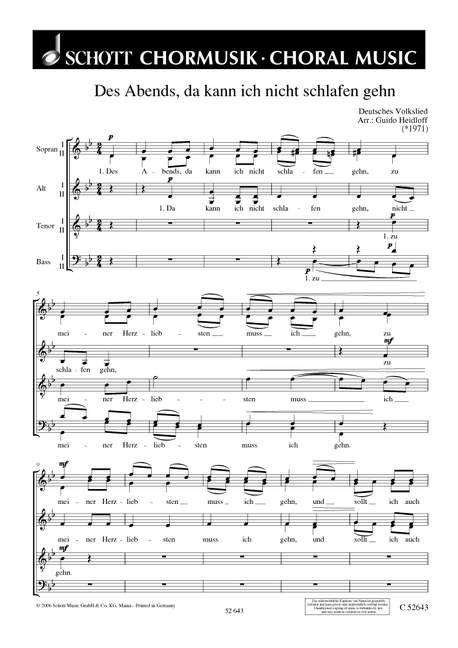 "Des Abends, da kann ich nicht schlafen gehn - Choral Score" Sheet Music by Guido Heidloff