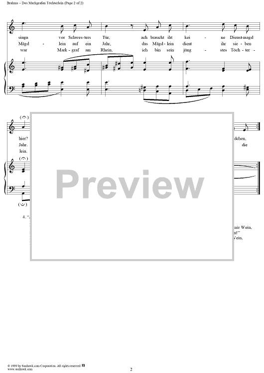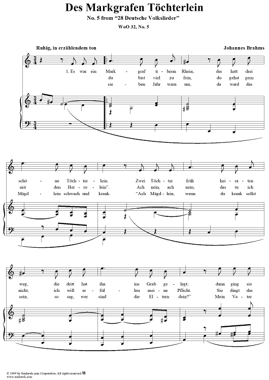 Digital Sheet Music for Des Markgrafen Töchterlein by Johannes Brahms scored for Voice/Piano; id:118458