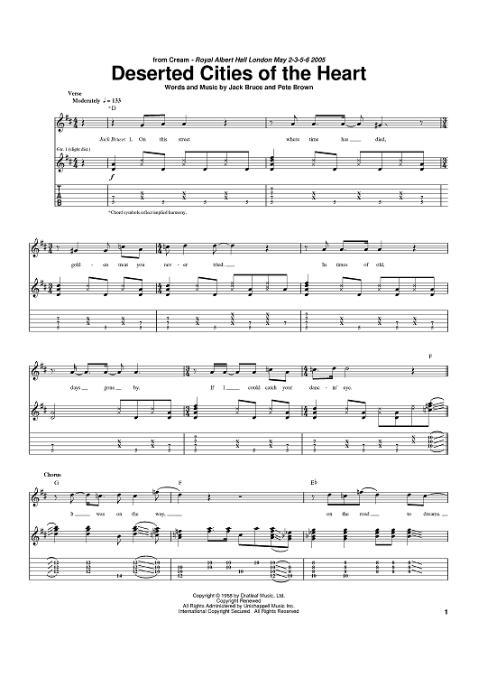 Digital Sheet Music for Deserted Cities Of The Heart by Cream, Pete Brown, Jack Bruce scored for Guitar Tab; id:392537