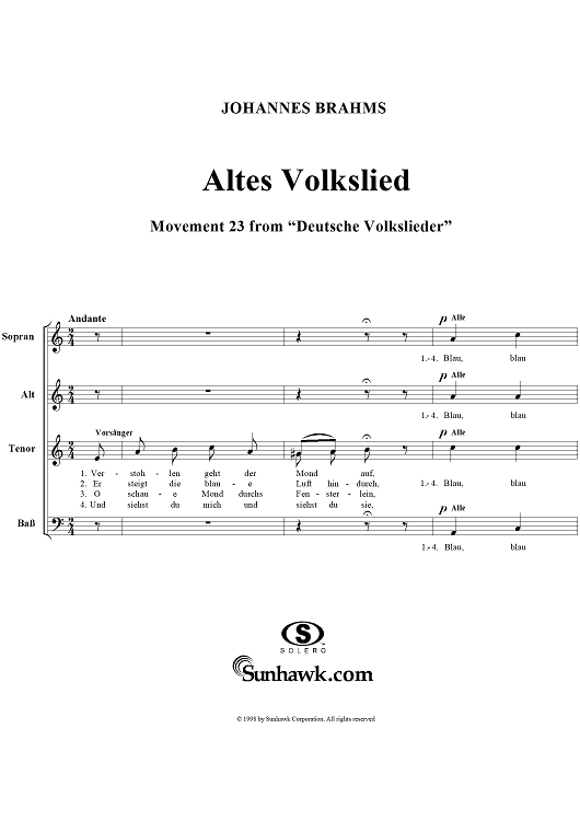 Digital Sheet Music for Deutsche Volkslieder, No. 23, Altes Volkslied by , Johannes Brahms scored for Four-part Mixed Chorus; id:274685