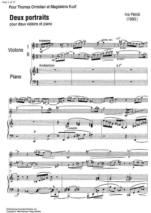 Digital Sheet Music for Deux portraits - Score by , Ivo Petric scored for Two Violins/Piano; id:334653