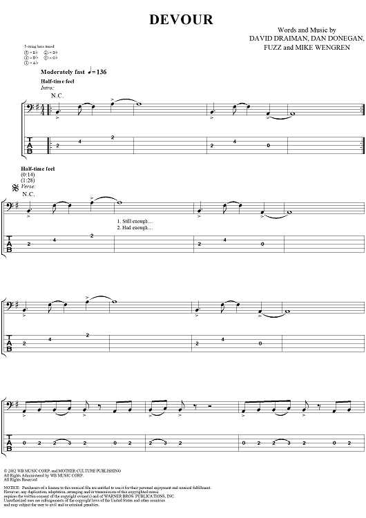 Digital Sheet Music for Devour by Disturbed, Mike Wengren, Dan Donegan, Fuzz, David Draiman scored for Bass Tab; id:294096
