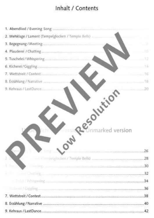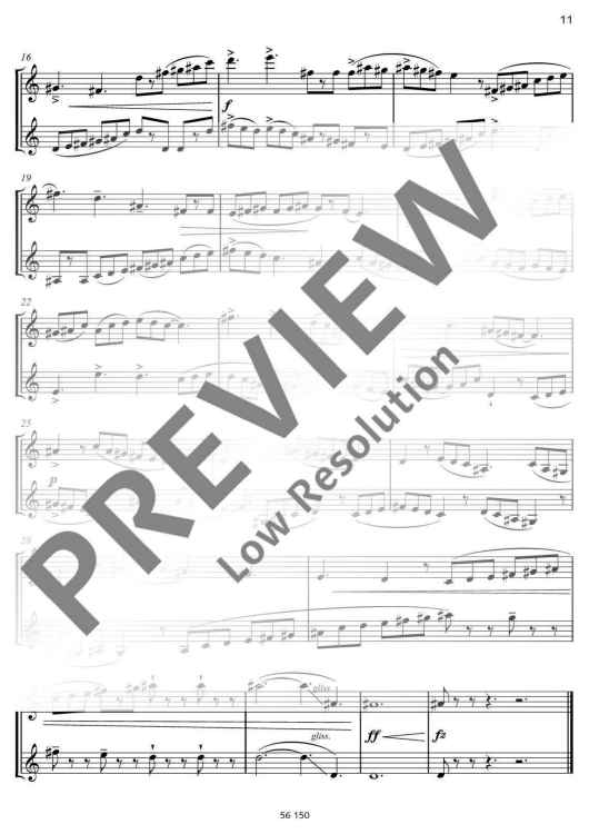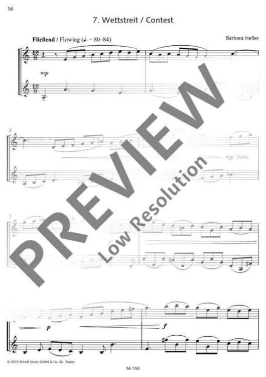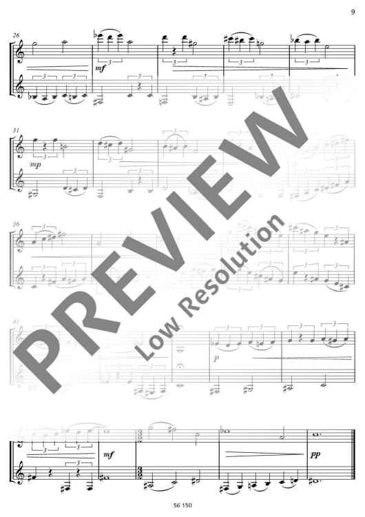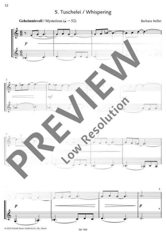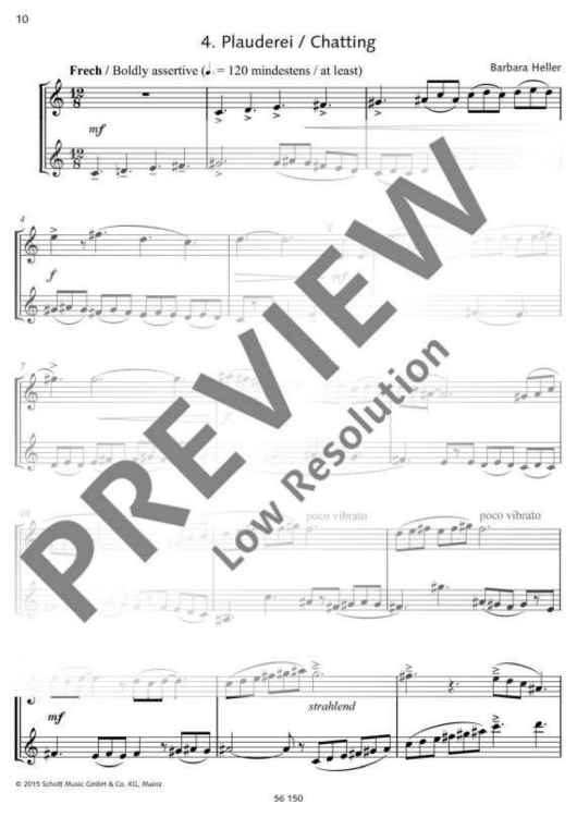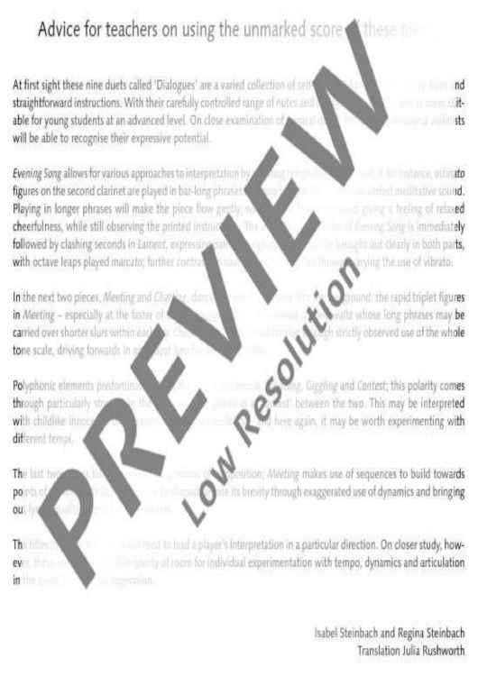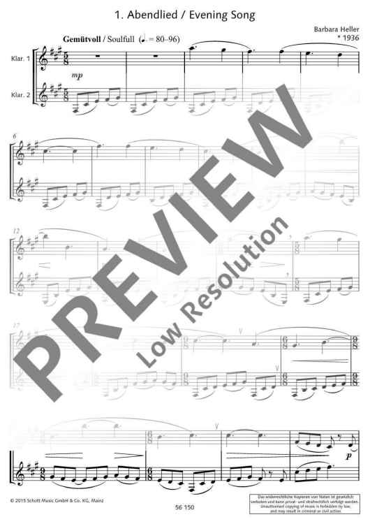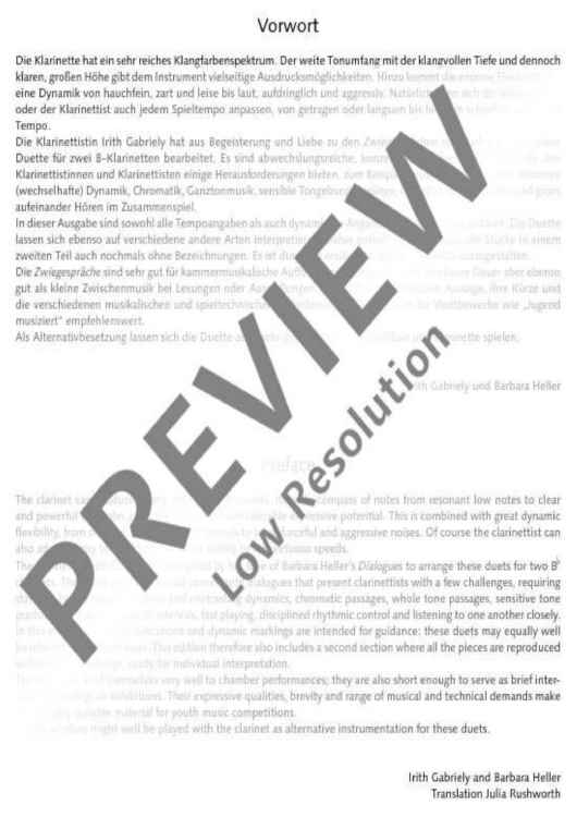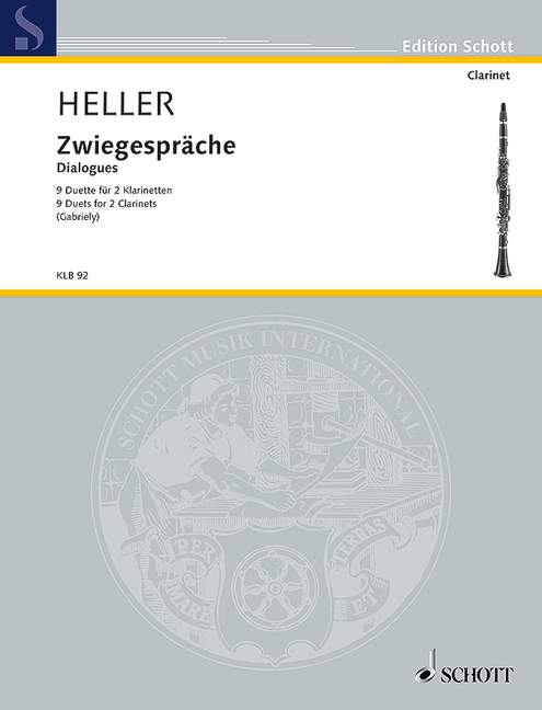 The clarinettist Irith Gabriely was inspired by her love of Barbara Heller’s Dialogues (for violin and viola) to arrange these duets for two Bb clarinets. The result is a set of varied concertante dialogues that present clarinettists with a few challenges, requiring stamina, breath control, intense and contrasting dynamics, chromatic passages, whole tone passages, sensitive tone production, leaps across wide intervals, fast playing, disciplined rhythmic control and listening to one another closely. In this edition all tempo indications and dynamic markings are intended for guidance: these duets may equally well be interpreted in other ways. This edition therefore also includes a second section where all the pieces are reproduced without such markings, ready for individual interpretation. The Dialogues lend themselves very well to chamber performances; they are also short enough to serve as brief interludes at readings or exhibitions. Their expressive qualities, brevity and range of musical and technical demands make them highly suitable material for youth music competitions. A flute or oboe might well be played with the clarinet as alternative instrumentation for these duets (ED 22017).