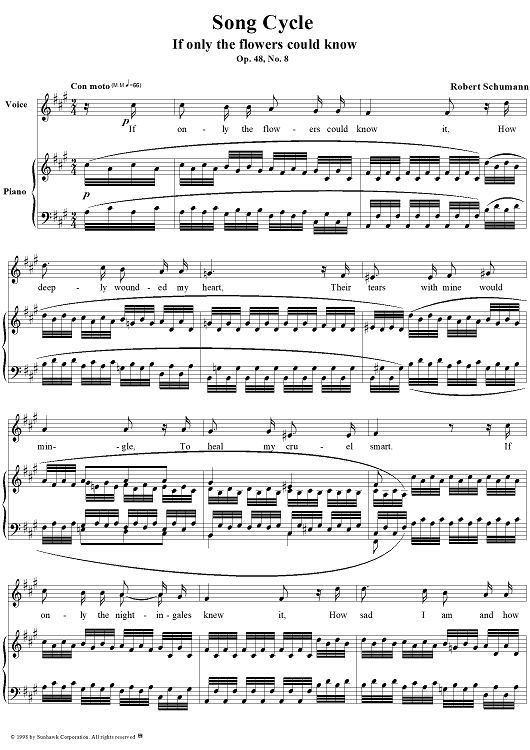 Digital Sheet Music for Dichterliebe (Song Cycle), Op. 48, No. 08: Und wüssten's die Blumen (If only the flowers could know it) by Robert Schumann, Heinrich Heine scored for Voice/Piano; id:257120