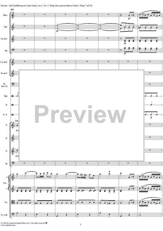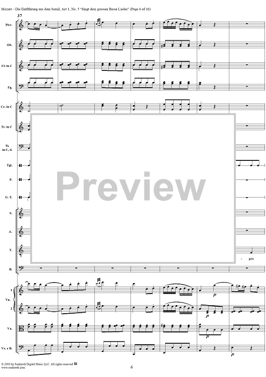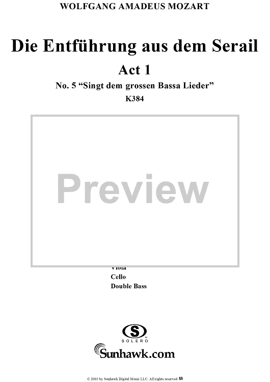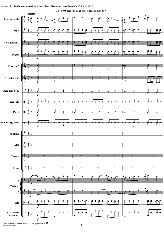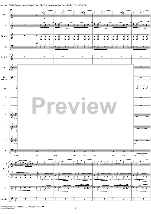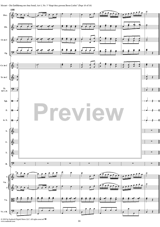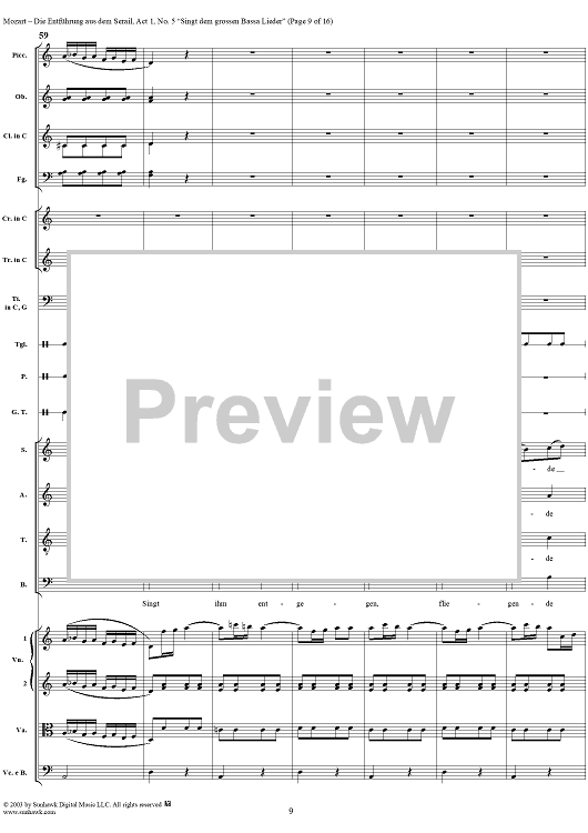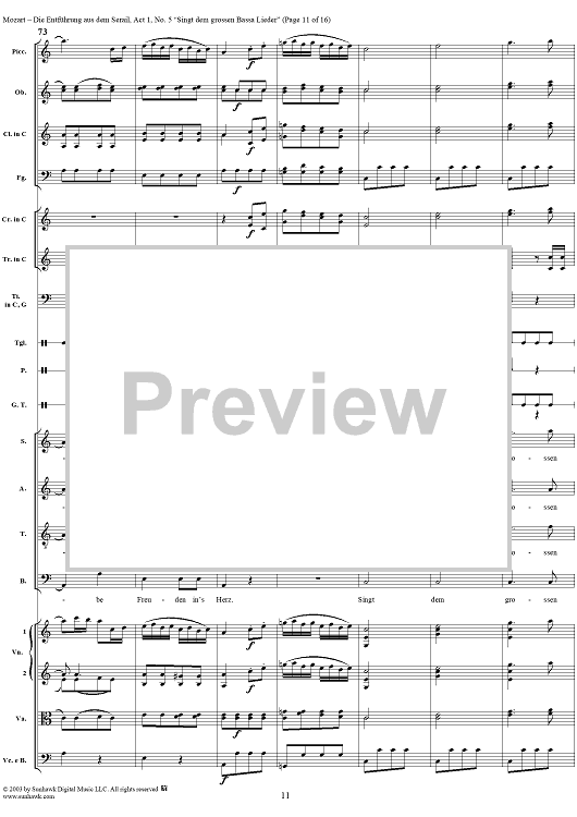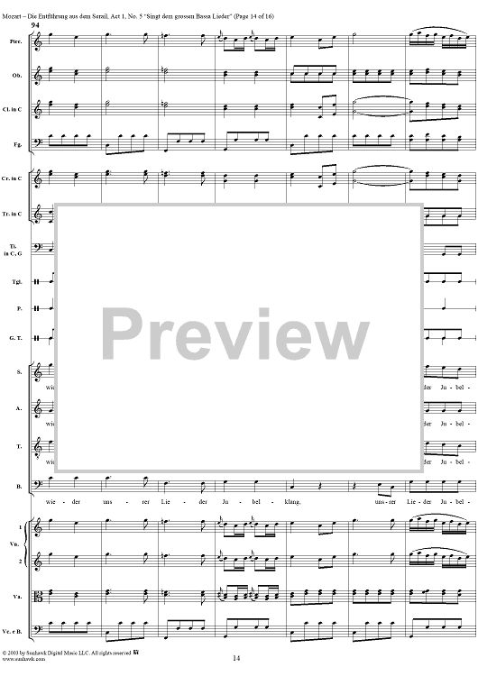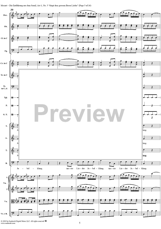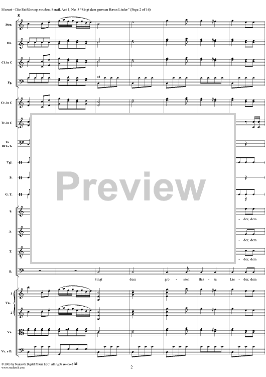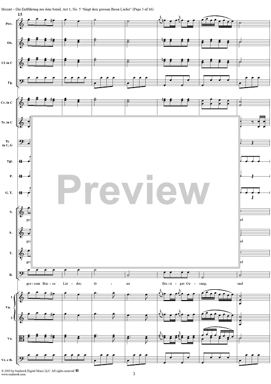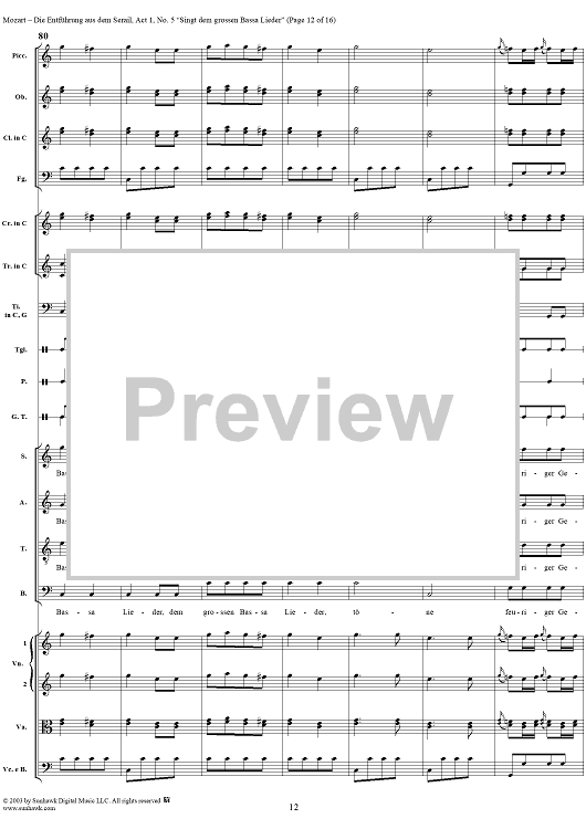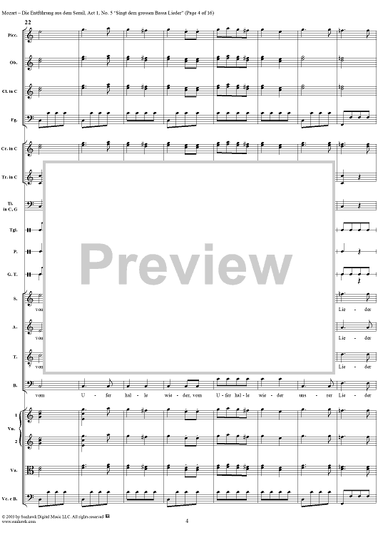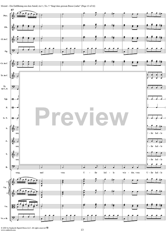 Digital Sheet Music for "Die Entführung aus dem Serail", Act 1, No. 5 "Singt dem grossen Bassa Lieder" - Full Score by Wolfgang Amadeus Mozart scored for Voice and Orchestra; id:292101