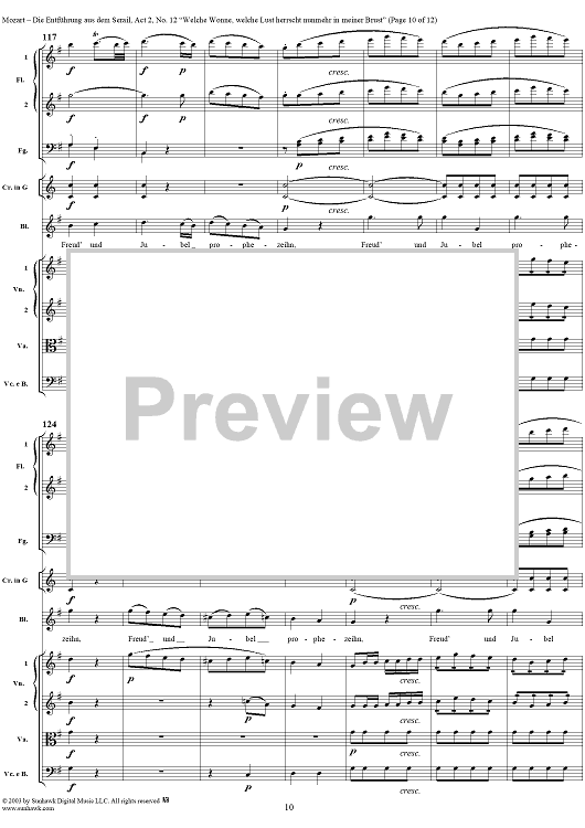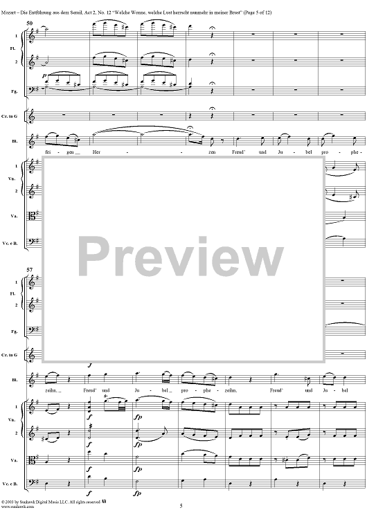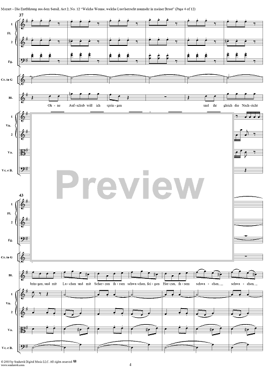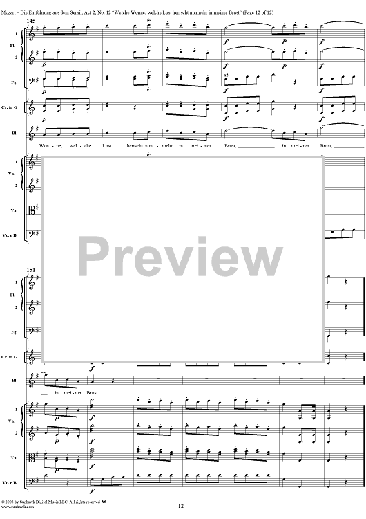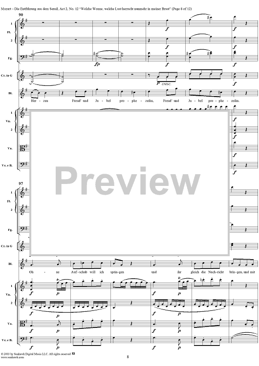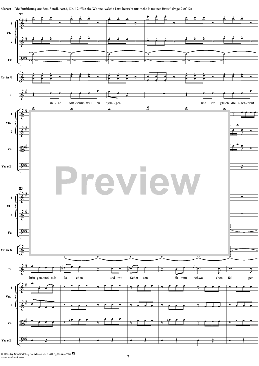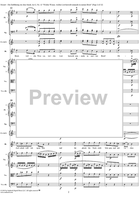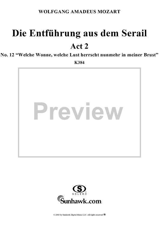 Digital Sheet Music for "Die Entführung aus dem Serail", Act 2, No. 12 "Welche Wonne, welche Lust herrscht nun mehr in meiner Brust" - Full Score by Wolfgang Amadeus Mozart scored for Voice and Orchestra; id:292110