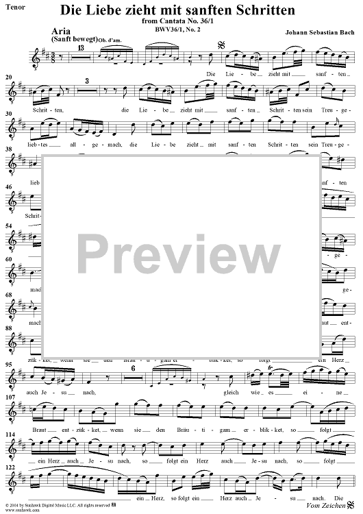 Digital Sheet Music for "Die Liebe zieht mit sanften Schritten", Aria, No. 2 from Cantata No. 36/1: "Schwingt freudig euch empor" - Tenor by Johann Sebastian Bach scored for Tenor, Oboe d'amore and Piano or Organ; id:304100