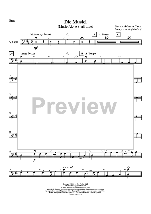 Digital Sheet Music for Die Musici (Music Alone Shall Live) - Bass by Traditional German Canon, Virginia Croft scored for Orchestra; id:406906